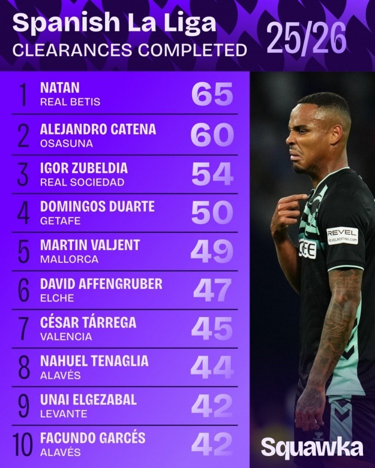 10月7日讯 日前,Squawka统计了本赛季西甲解围次数排行,贝蒂斯后卫纳坦65次居首,祖贝迪亚54次第三。