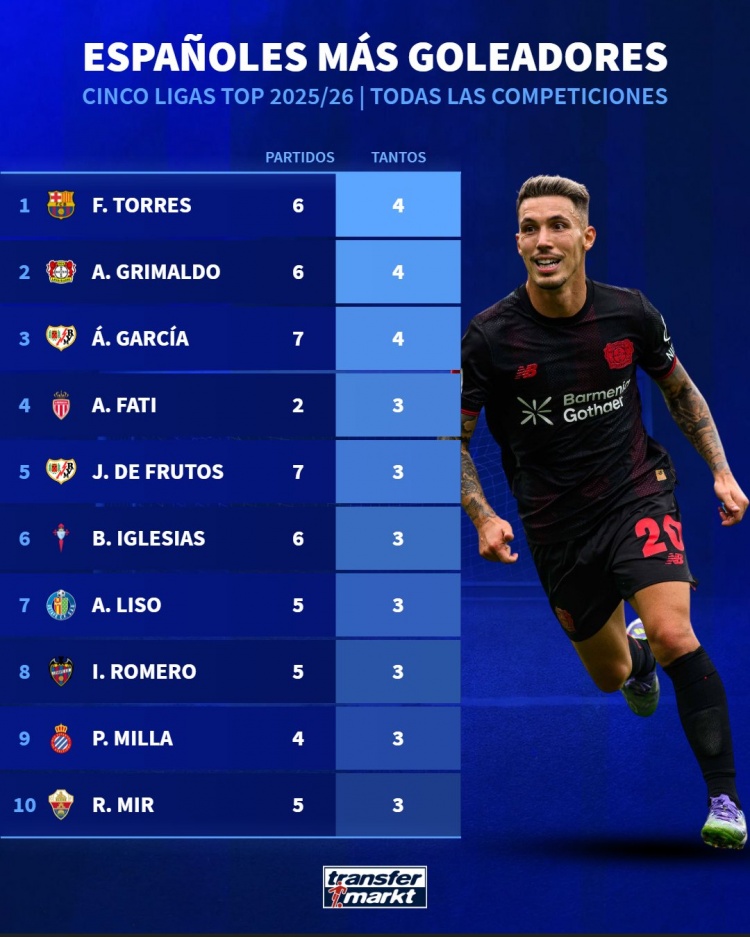9月23日讯 德国转会市场统计了五大联赛西班牙球员本赛季的进球数量,并列出榜单,费兰-托雷斯、格里马尔多、A-加西亚4球居首。