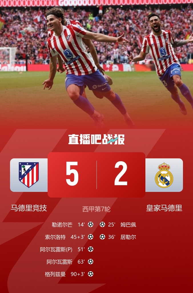 平均每人少跑2km!德比战皇马球员平均跑动仅7.8km 马竞高达9.6km